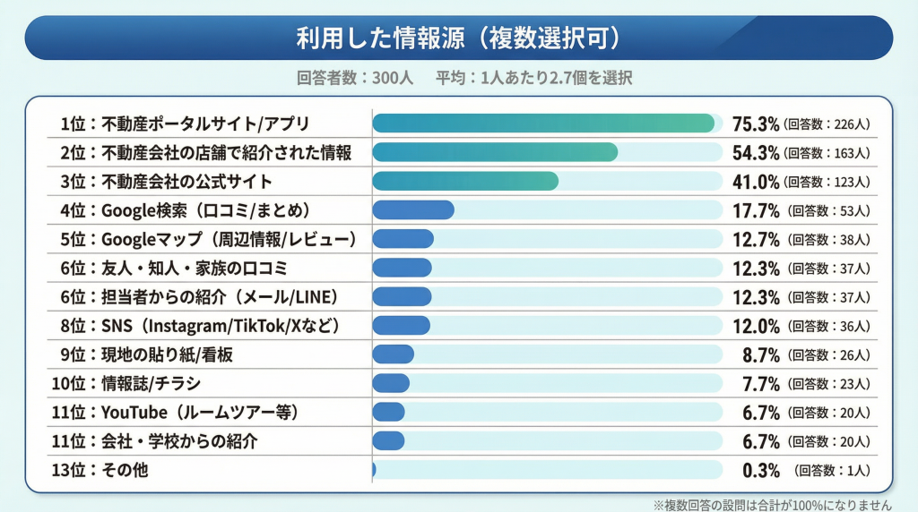 1人あたり平均2.7個を併用している事実は、部屋探しが単一の情報源では完結せず、複数のチャネルを組み合わせて情報を集める行動パターンが定着している実態を示しています。