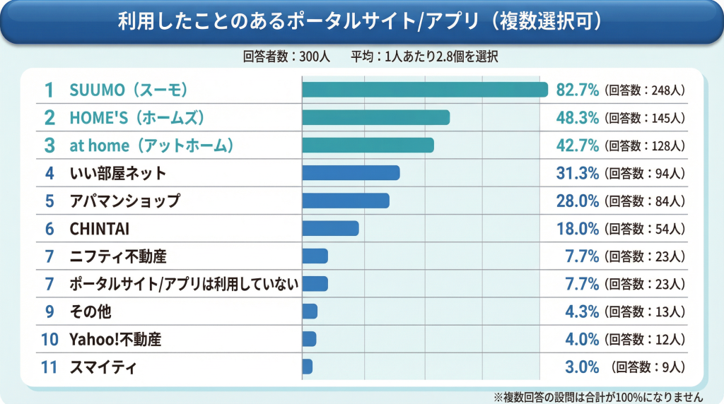 2位のHOME’Sが約半数、3位のat homeが4割超を占める点は、複数のポータルを併用して物件を探す行動が一般的であることを示しています。同じ物件でもポータルによって掲載情報が異なる、特定のポータルにしか出ていない物件がある――こうした事情が、複数併用を促しています。