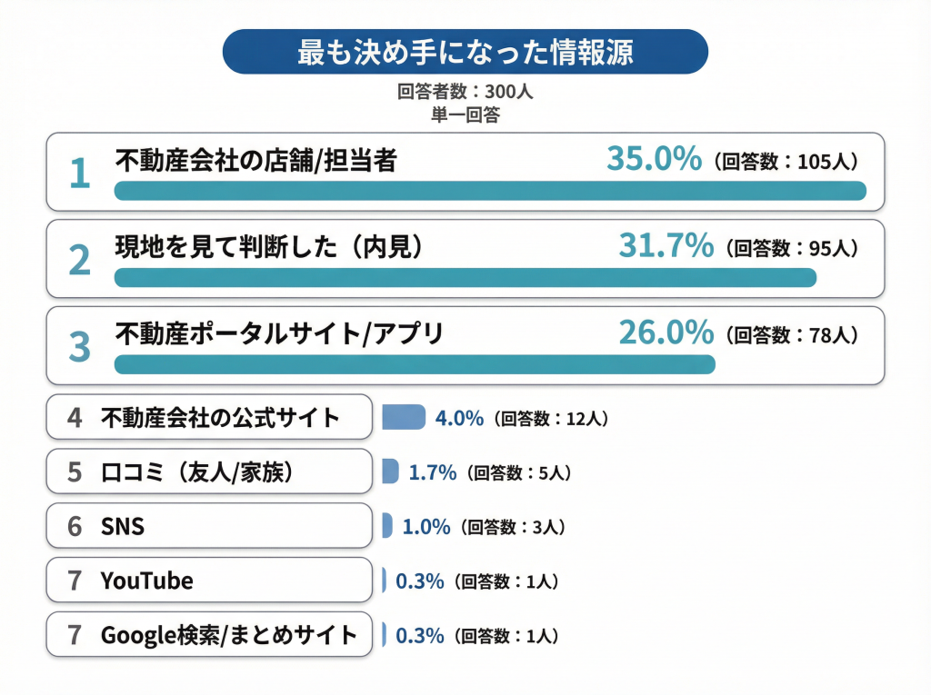 一方で、不動産ポータルが3位で26.0%にとどまる点は重要です。結果2で75.3%が利用しているにもかかわらず、決め手としては3割以下――この差が、情報収集はデジタル、最終判断は対面・現地という構図を浮き彫りにしています。