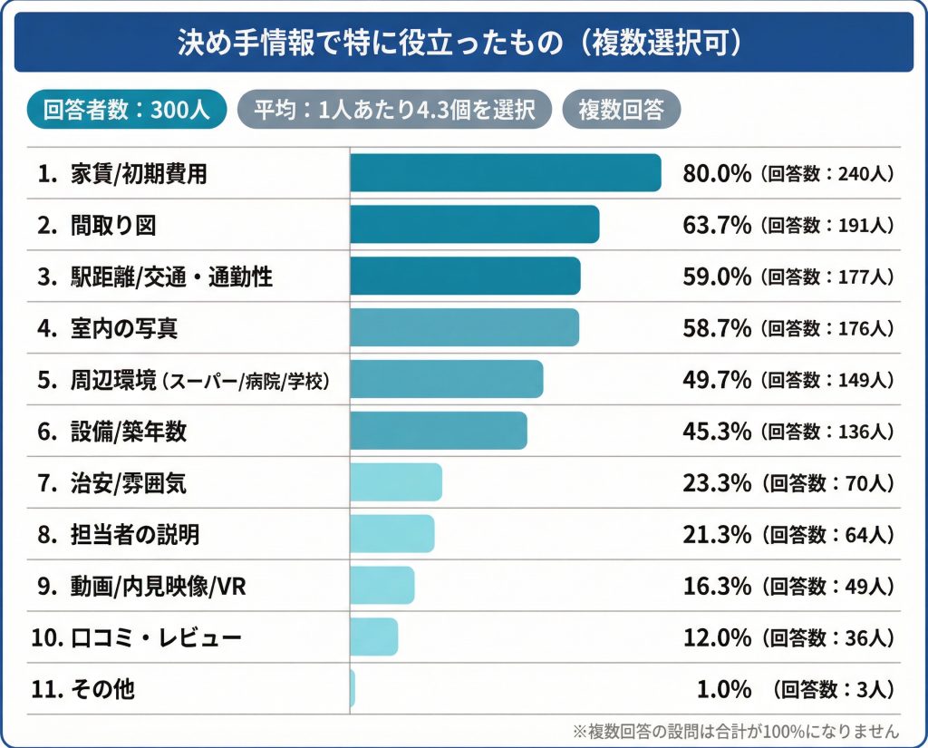 【結果5】決め手になった情報で役立ったもの:家賃/初期費用80.0%(240人)が圧倒的。1人あたり平均4.3個を選択
