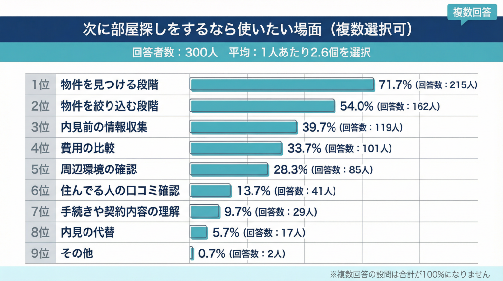 【結果7】次に部屋探しをするとしたら使いたい場面:物件を見つける段階71.7%(215人)が最多。1人あたり平均2.6個を選択