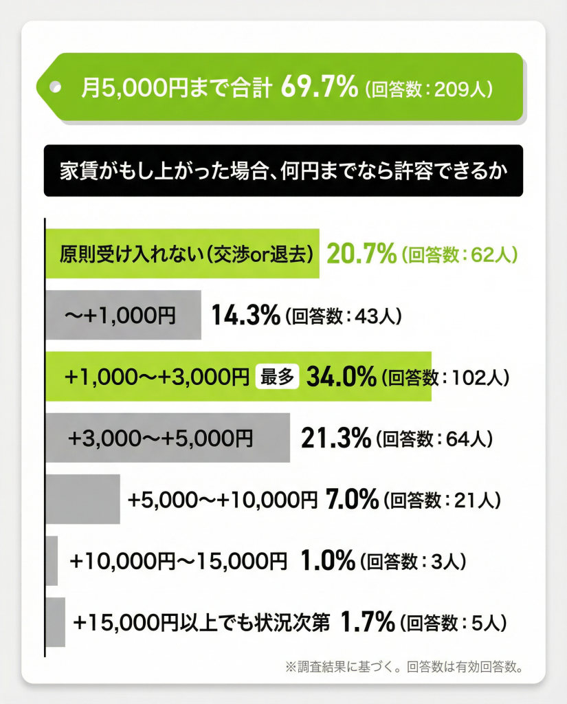 家賃が上がった場合の許容額は、月5,000円までが69.7%(209人)でした。内訳としては+1,000〜+3,000円34.0%(102人)が最多。