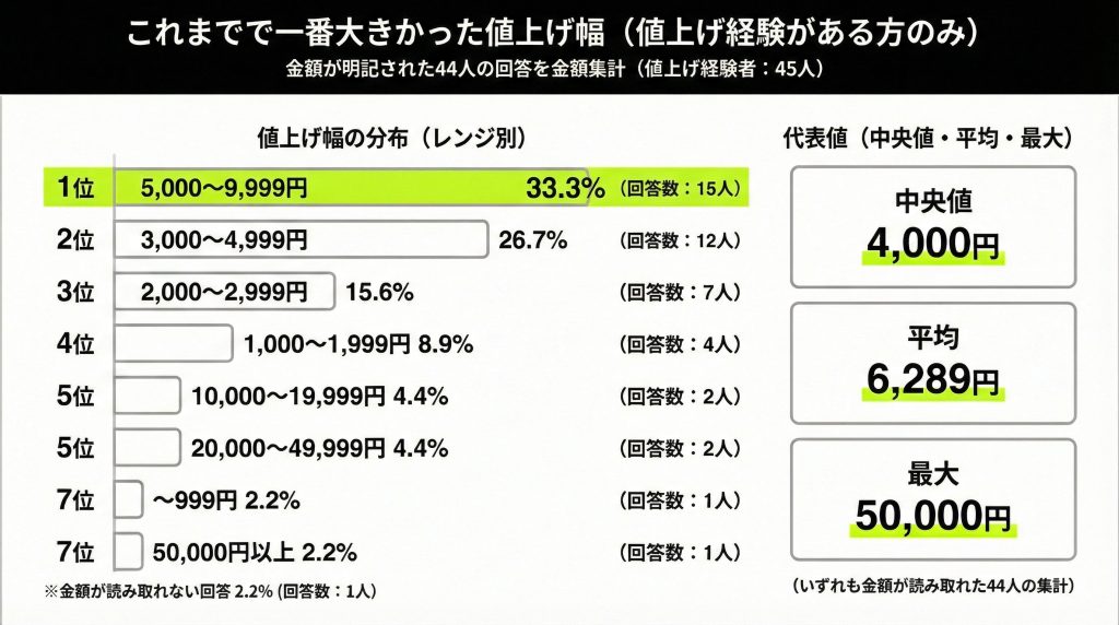 レンジ別では5,000〜9,999円が最多で、次いで3,000〜4,999円が続きました。個別の金額としては3,000円が最多で、数千円単位の値上げが典型像となっています。