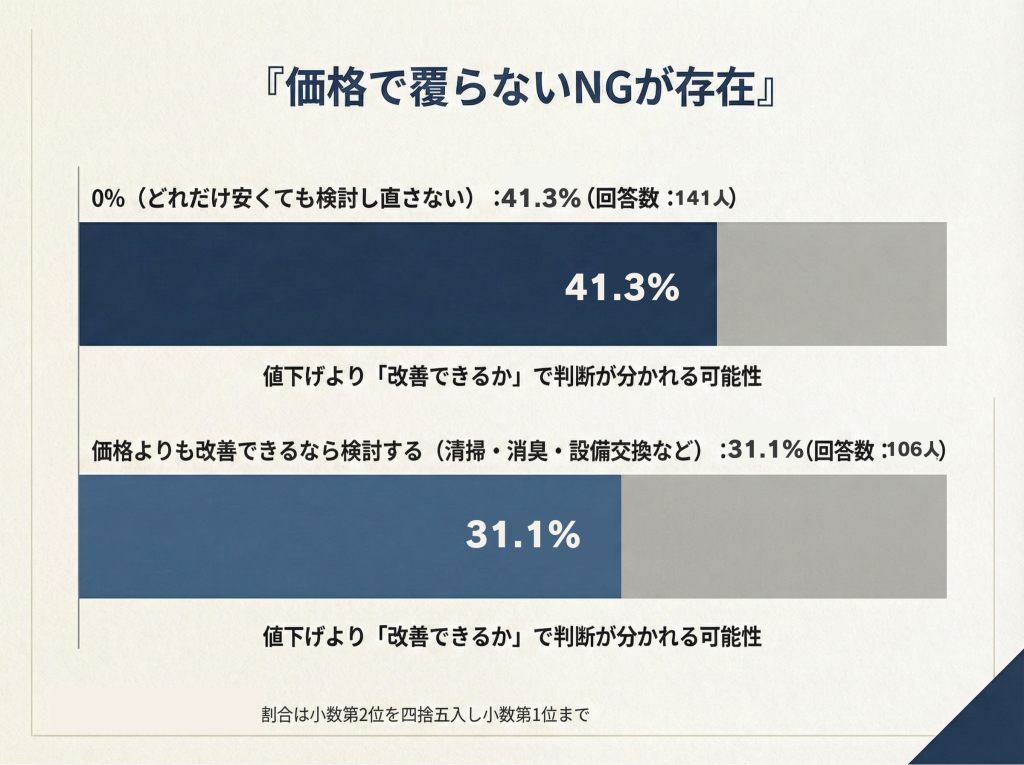 一方で、価格よりも改善できるなら検討する(清掃・消臭・設備交換など)も31.1%(106人)と多く、値引きよりも「直せるかどうか」を重視する層が一定数いることが分かります。